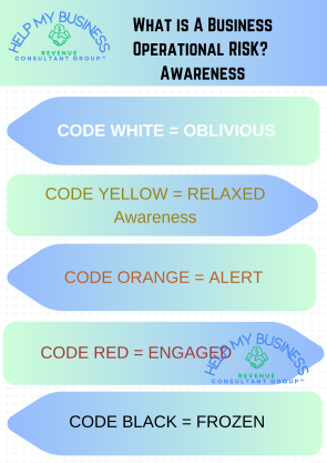 Today's Blog will be short and will briefly blog about code white and code yellow. A business owner ability to assess risk is a skill that comes with experience. Help My Business Revenue Consulting Group brilliantly applies Cooper Color Code of Awareness to Revenue Strategies. White ,Yellow, Orange ,Red and Black